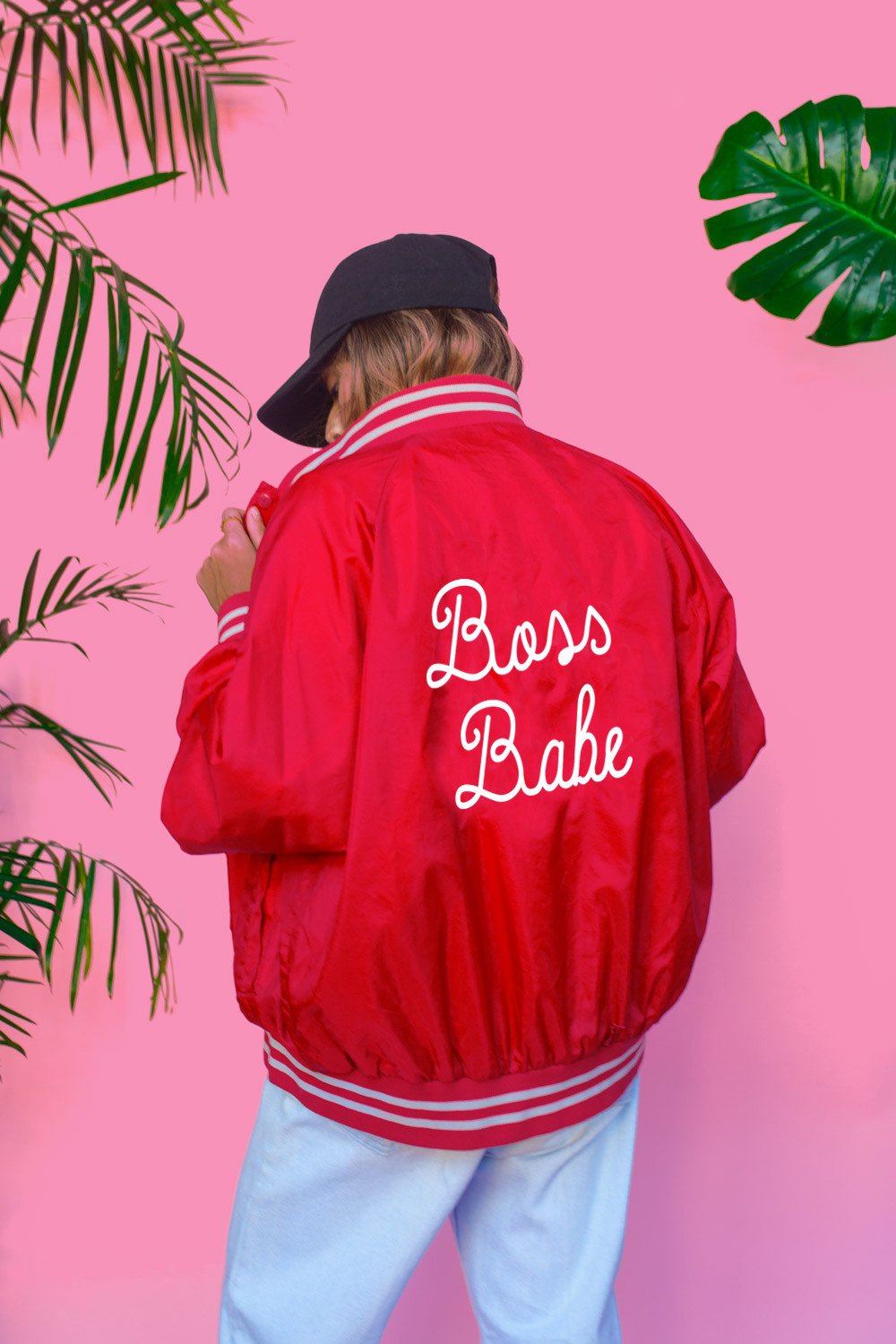 Boss Babe Jacket by TasteTheStyle. In this classic athletic jacket. This vintage inspired oversized bomber silhouette comes with a satin finish trimmed with striped rib-knit accents. Button up at the front with pockets and finished with the Boss Babe embroidered detail on the back designed by the Boss Babe herself Cyndi Ramirez!