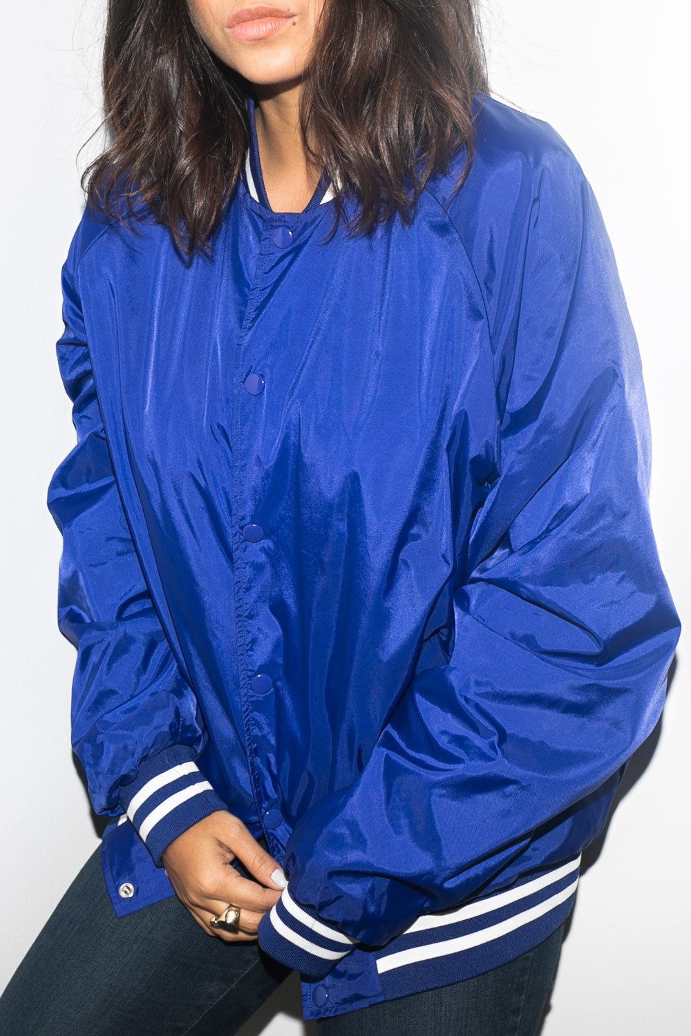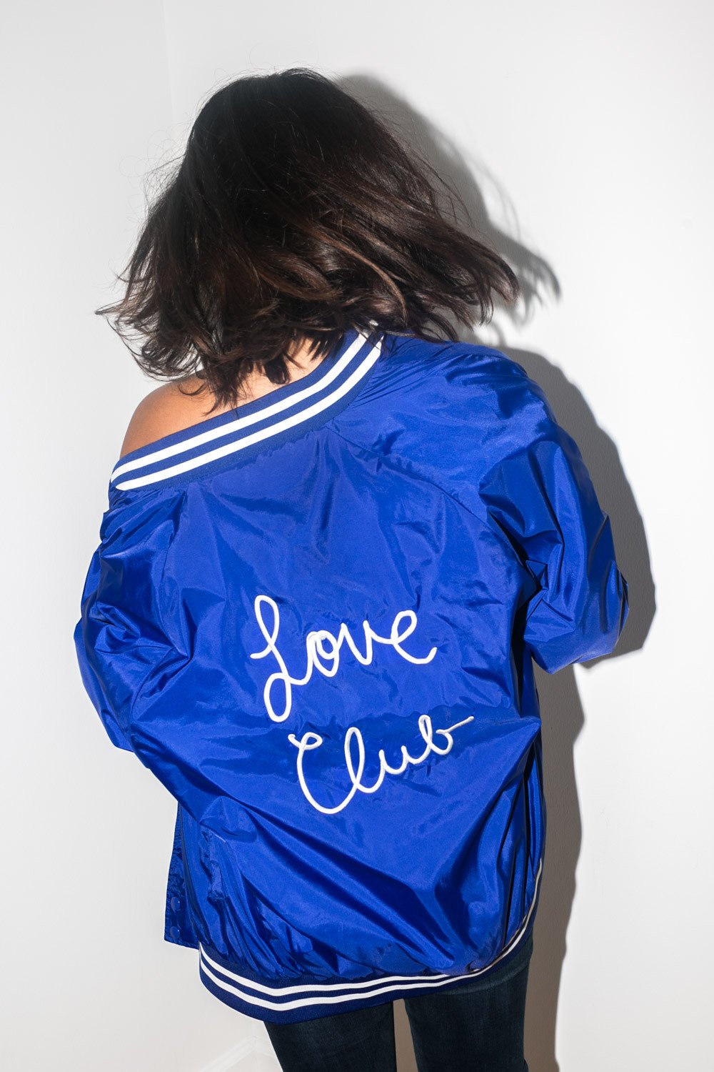 Remind the world to love again in this classic athletic jacket. This vintage inspired oversized bomber silhouette comes with a satin finish trimmed with striped rib-knit accents. Button up at the front with pockets and finished with the Love Club embroidered...